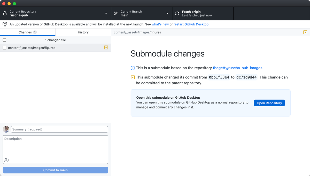 Commit the record of the submodule change to the parent repository: Navigate back to the parent repository in GitHub Desktop and it will show just a single change to the