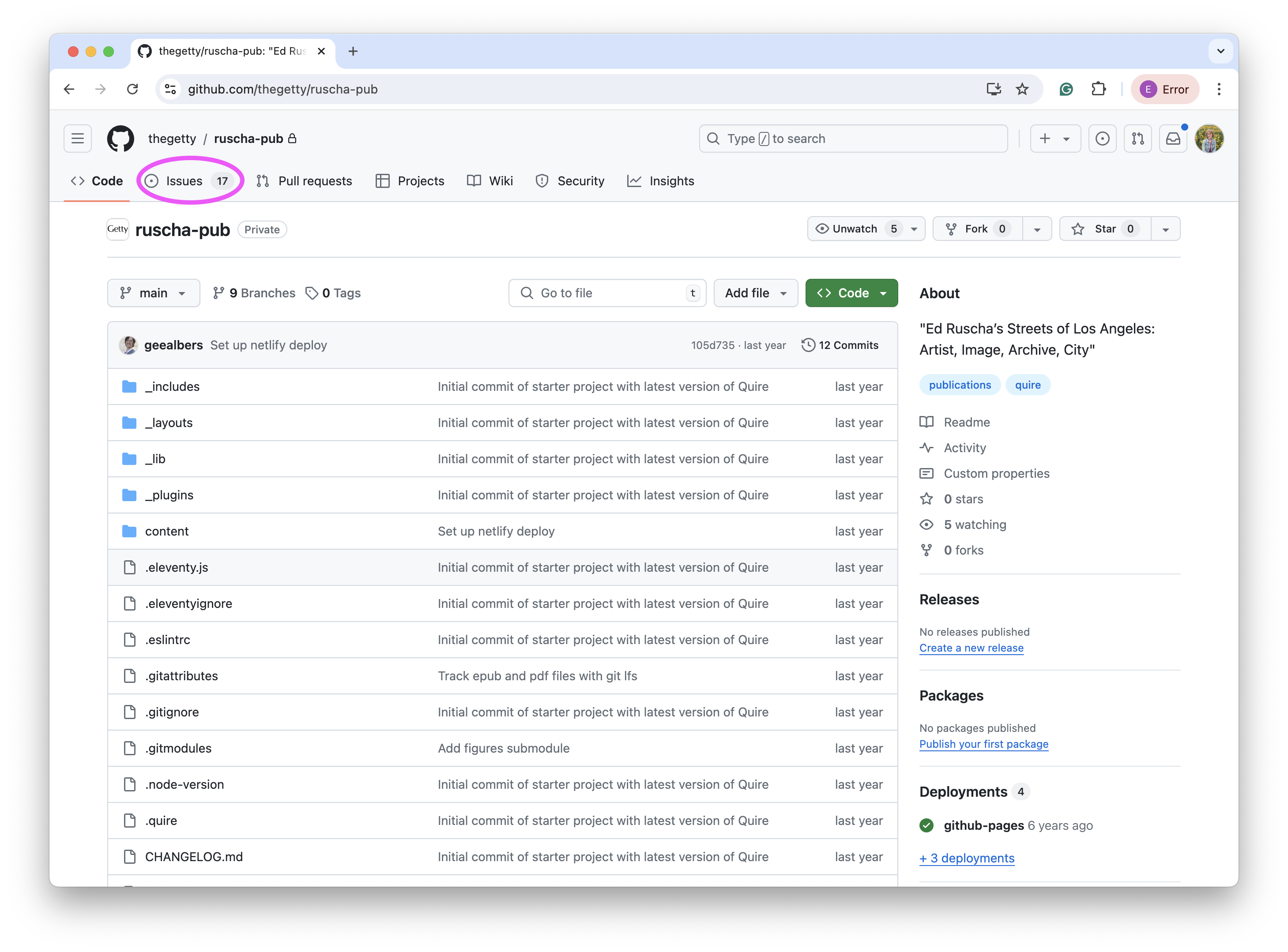 As detailed in the “Repository and Deploy Setup” section of this guide, Quire sites are hosted on Netlify and a proxy URL is set up to direct users to the final publication URL. We also use Netlify to generate preview sites during each stage of the project’s development. These links are shared with the project editor, authors, proofreader, and others as needed, along with the PDFs.